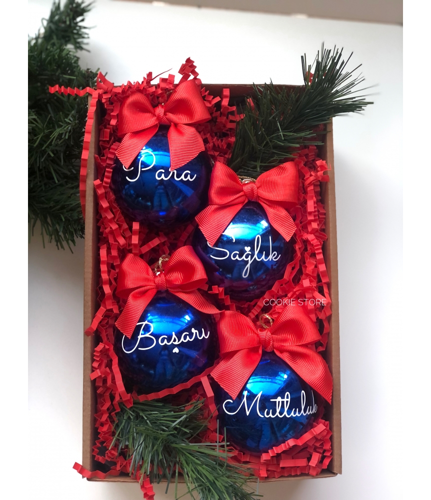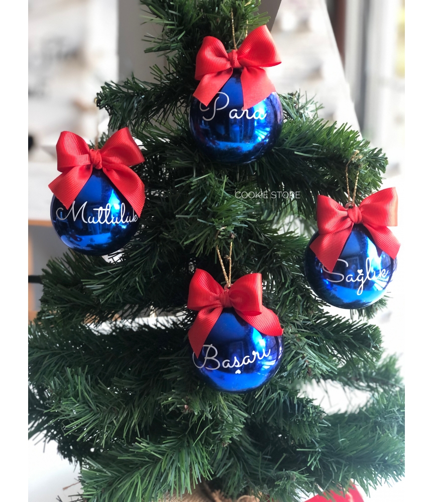 Mavi renk 8 cm boyutunda dört adet yeni yıl dileklerinden oluşan yılbaşı ağaç süsüdür.